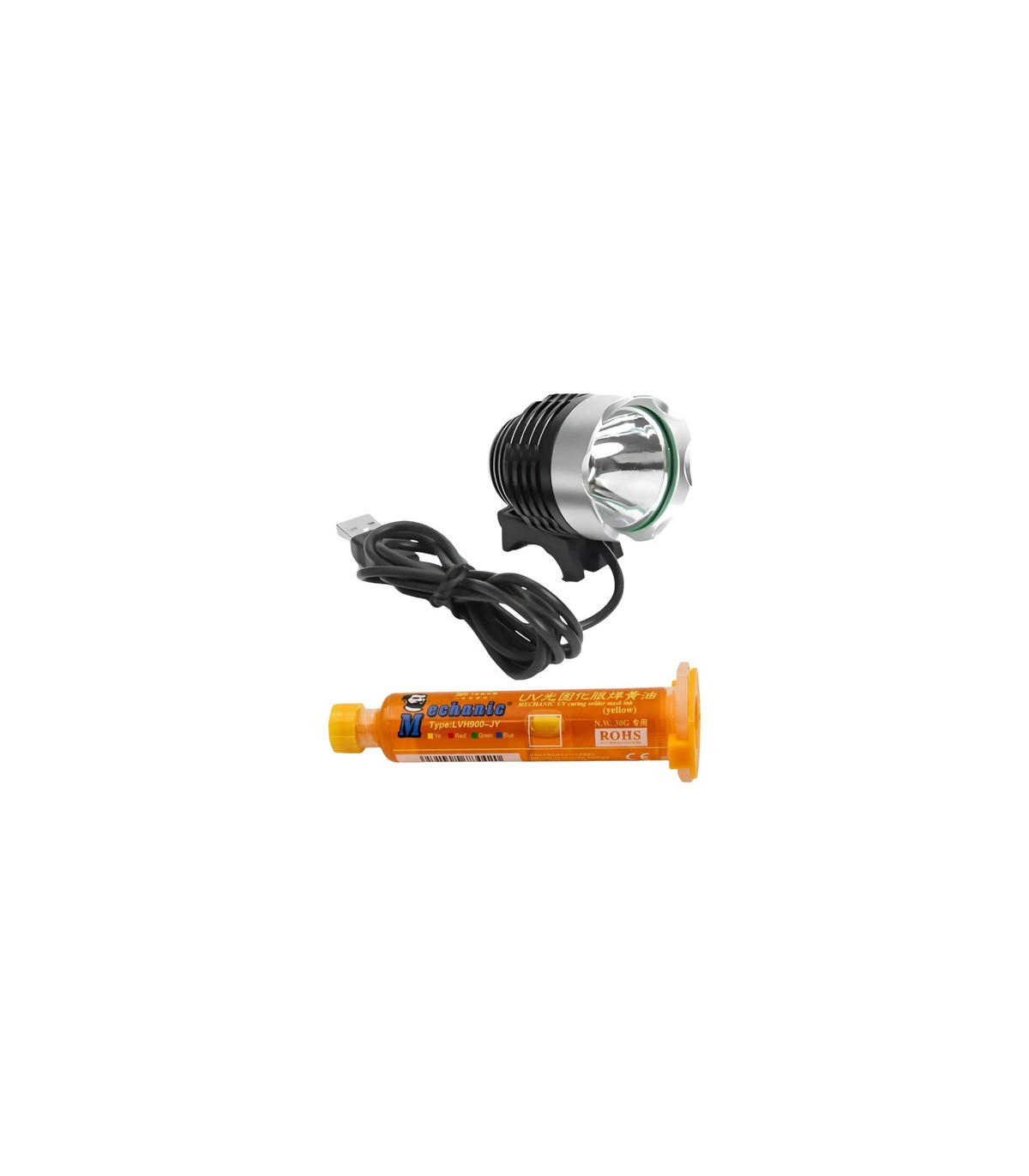 LAMPARA UV USB Potencia 5W Voltaje: 5V T6 luz púrpura LED Wavelength 395-400nm Esta mini luz seca la soldadura UV Mástil para reparación de chip IC Utilice los puertos USB, con un volumen pequeño. Muy conveniente. Mascara de Curado UV Mechanic UVH900 10 cc - Color Amarillo.